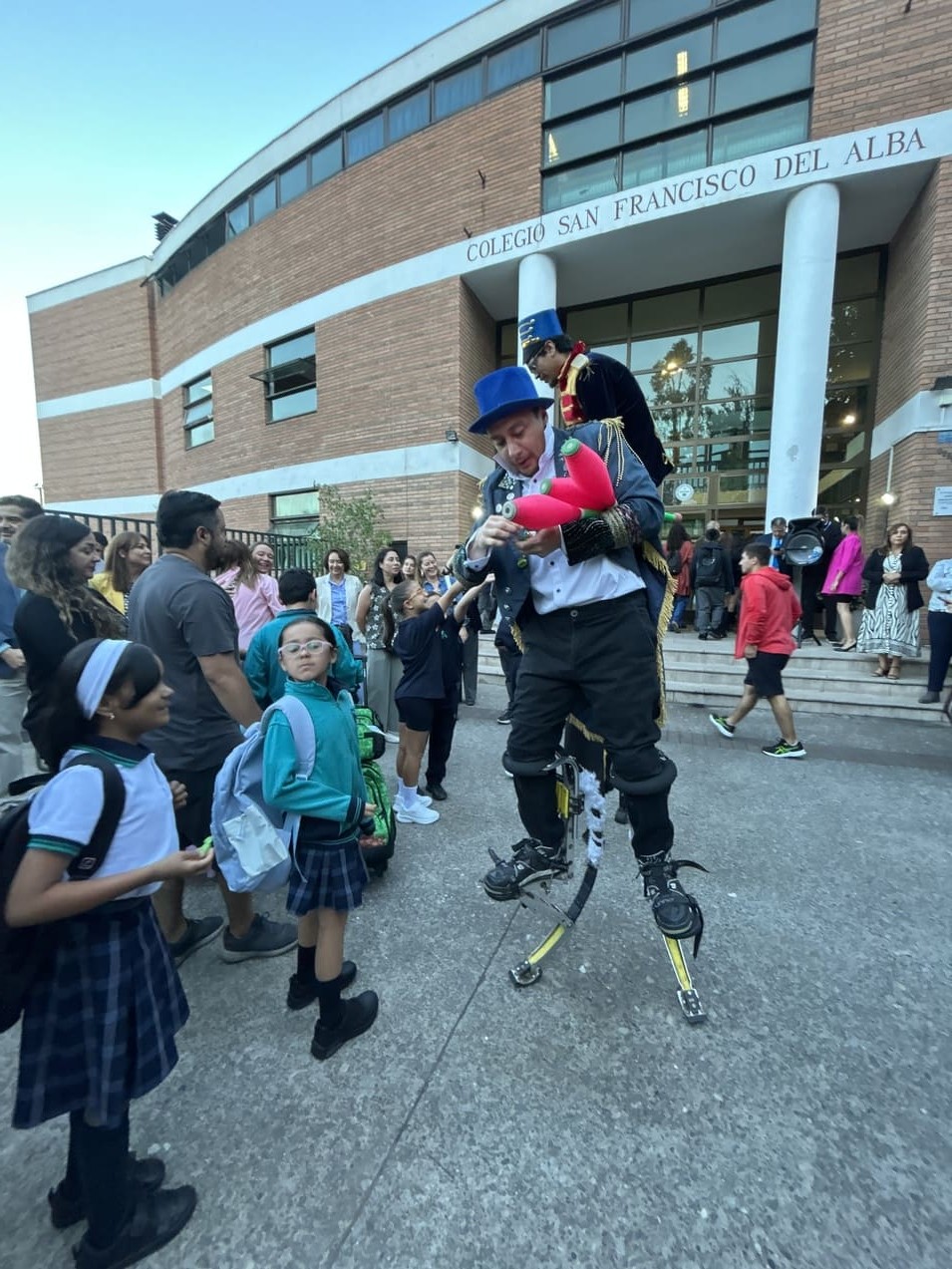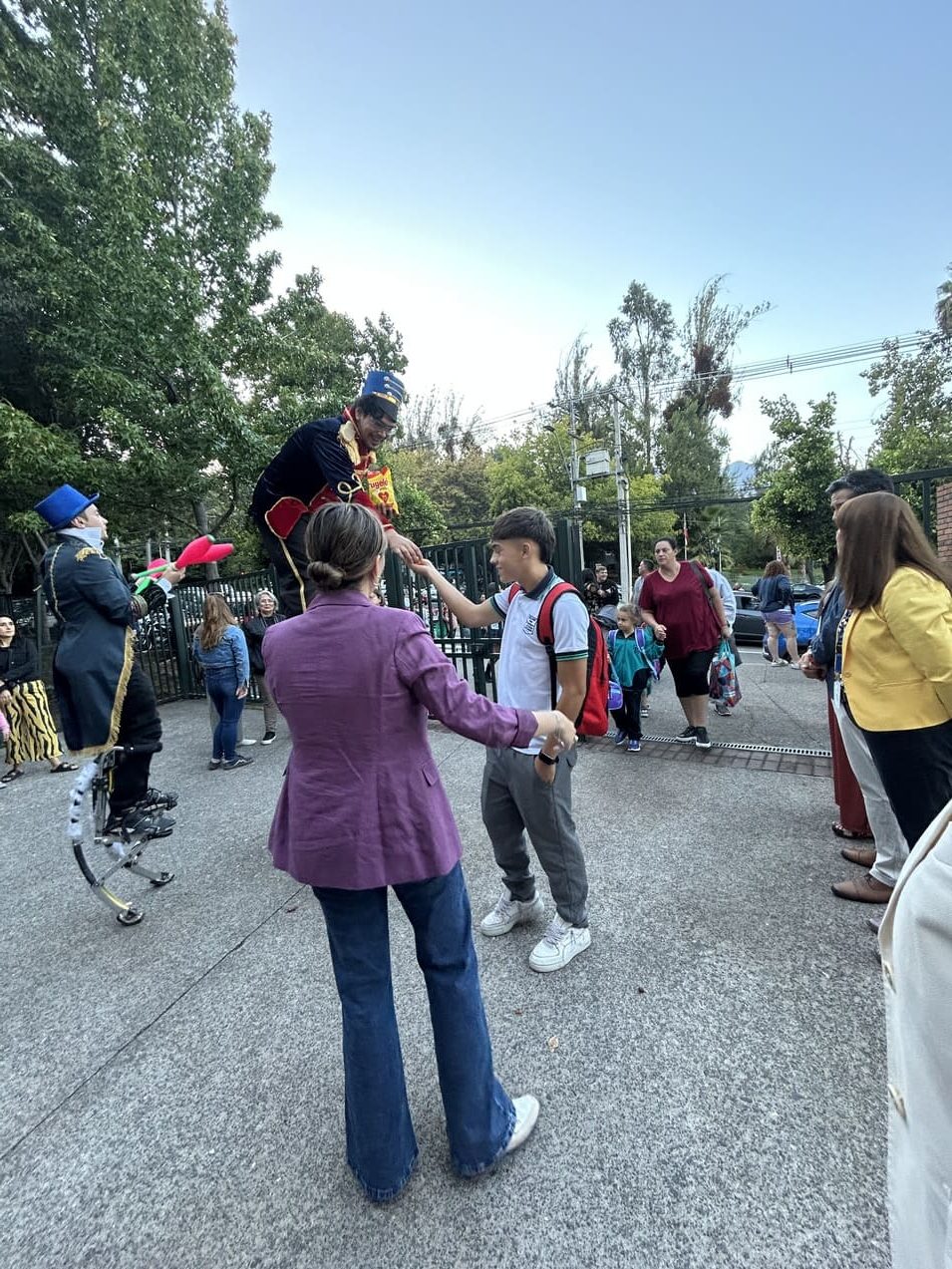 La jornada estuvo acompañada de malabaristas y un zanquista, quienes aportaron color y alegría para recibir a la comunidad educativa como se merece.
