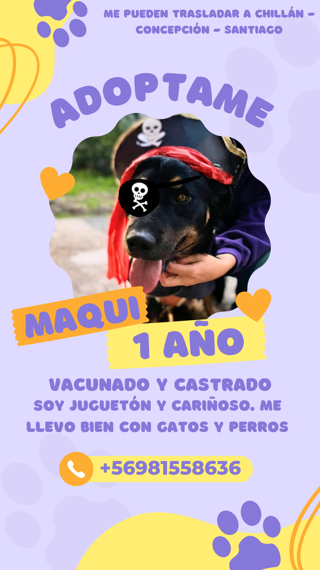 Macho MedianoPerrito de un año en adopción. Le falta un ojito. Está castrado y vacunado. Está en Chillán pero se puede trasladar a Santiago. Se busca...