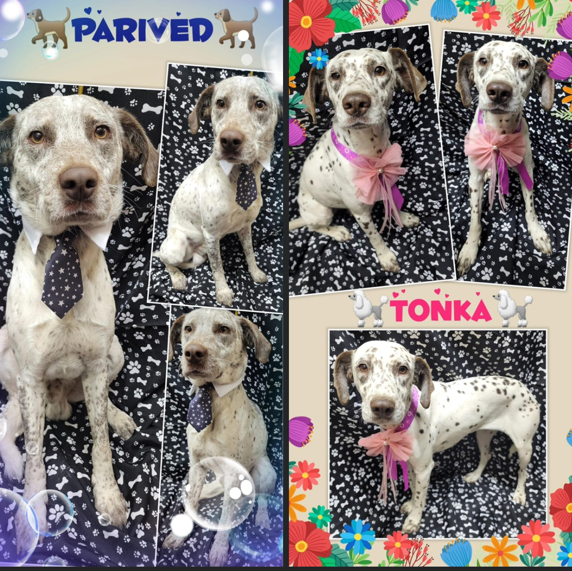 Hembra Medianomestizos de Dalmata ATONKA y APARIVED Ai, madre he hijo, sus dueños los fueron a botar a un campo de Noviciado, están en extrema delgadez, Tonka...