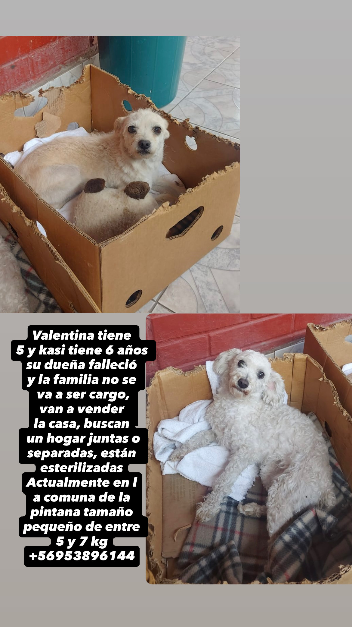 Hembra PequeñoValentina tiene 5 y kasi tiene 6 años su dueña falleció y la familia no se va a ser cargo, van a vender la casa, buscan un hogar juntas o...