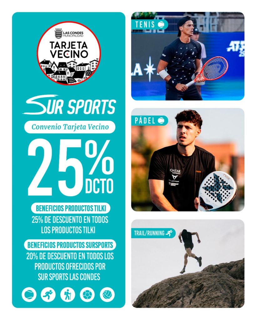 • 20% de descuento en todos los productos ofrecidos por Sur Sports Las Condes.