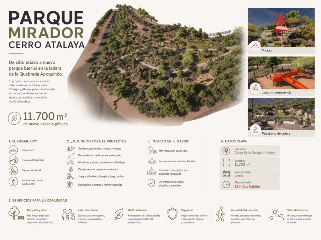 El Concejo Municipal aprobó la adjudicación del proyecto Parque Mirador Cerro Atalaya, una iniciativa que busca recuperar un espacio deteriorado en la ladera de la Quebrada Apoquindo y convertirlo en un área verde de uso barrial. La intervención considera una superficie aproximada de 11.700 m² y apunta a resolver problemas actuales del lugar, como la baja accesibilidad, la escalera en mal estado y las deficientes condiciones de iluminación y control, factores que han afectado su uso seguro y continuo por parte de la comunidad.